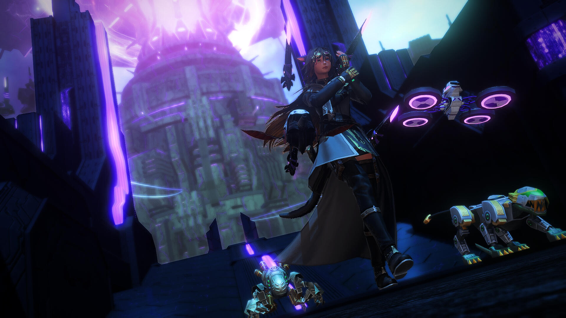 > Miniature Electrope Remote-Controlled drones (M.E.R.C., in-game model: Metanoia, dyed Jet Black and Metallic Purple) - Constructed from a mix of magitek parts, electrope salvaged from the fighting in Shaaloani, and using nouliths as a base, the set of drones fire off bursts of levin to allow for suppressive fire.